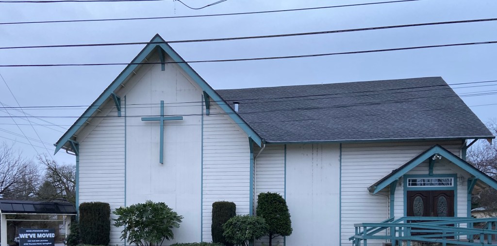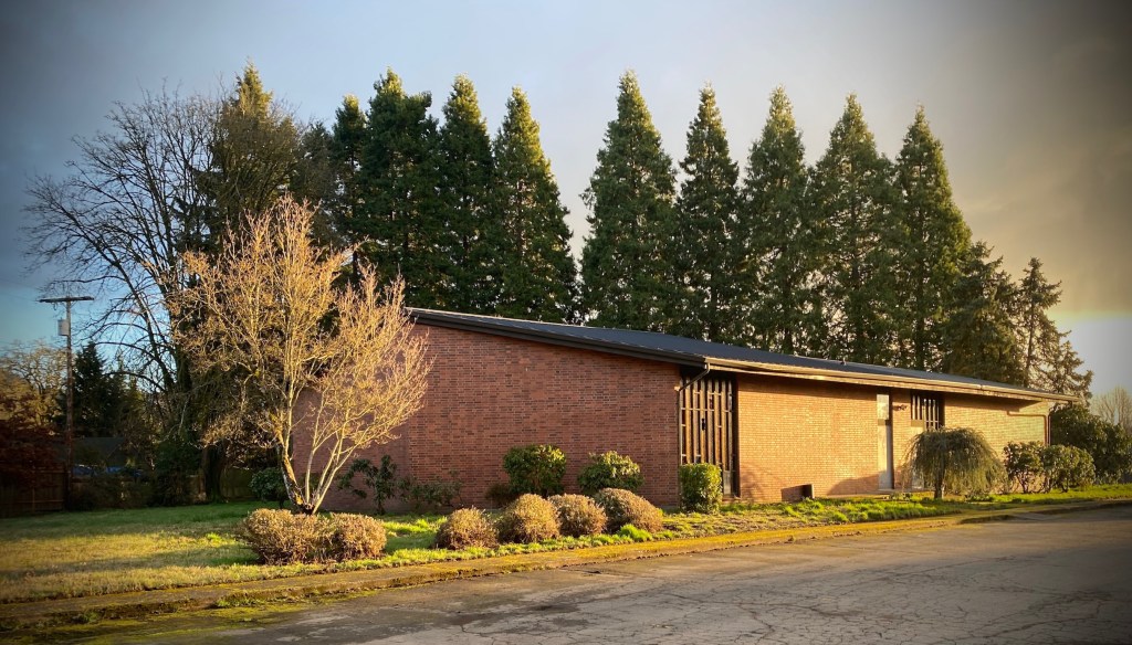 Services are currently being held in the fellowship hall on the east side of the facility. The main entrance is located on the south side of the building.